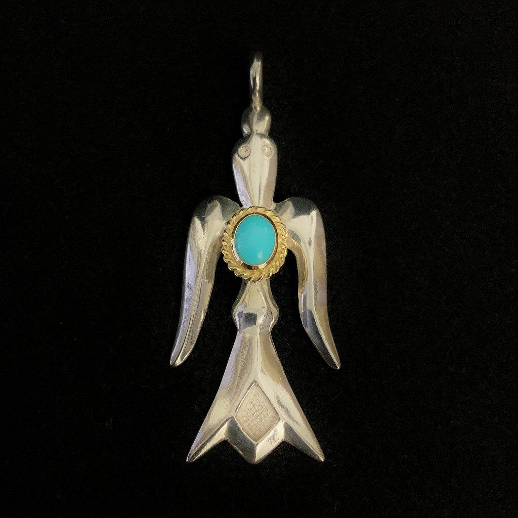 Merging the earthy allure of turquoise with the opulence of gold and silver, the Goros Bird Turquoise Pendant is a masterpiece of jewelry design.