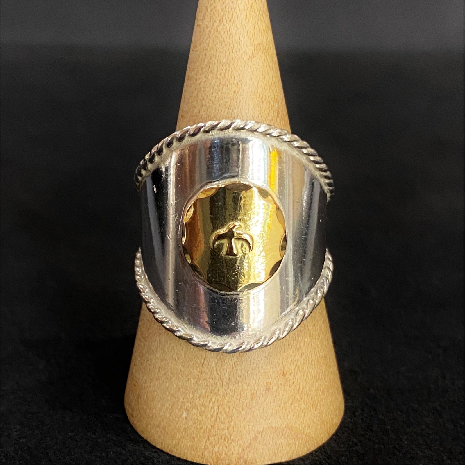 This ring exudes sophistication with its sleek, flattened design, which provides a modern touch to the timeless appeal of mixed metals. The silver's cool sheen perfectly balances the warm radiance of the gold, ensuring this